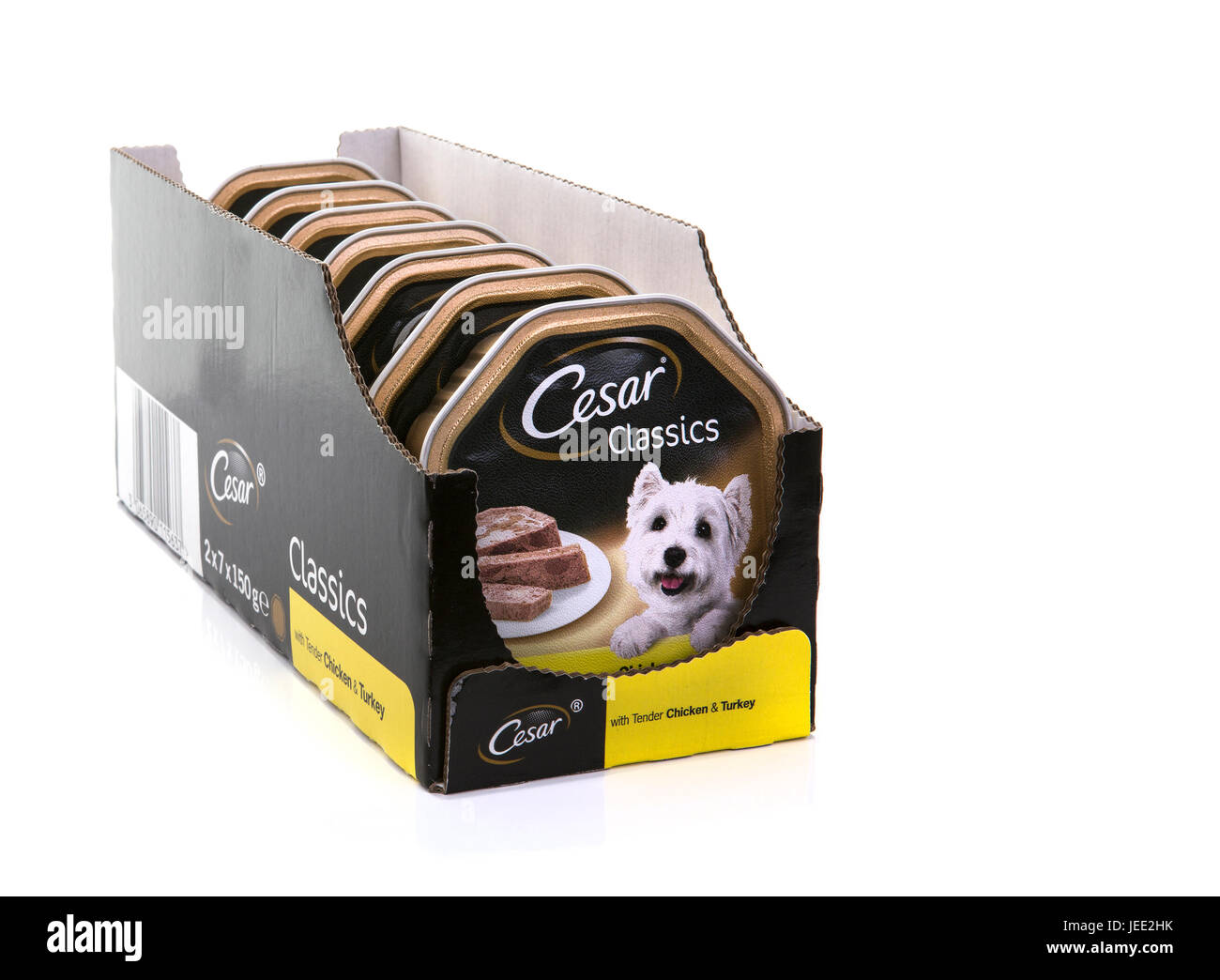 Swindon Uk June 24 2017 Seven Pack Of Cesar Classics Chicken And Turkey Dog Food On A White Background Stock Photo Alamy